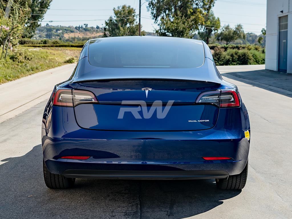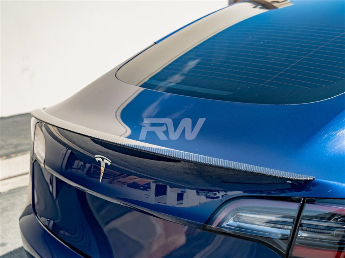Distinguish your Tesla Model 3 with a brand new upgraded look with this RW Carbon Tesla Model 3 Carbon Fiber Trunk Spoiler. This carbon fiber trunk spoiler is crafted from genuine dry carbon fiber and finished with a clearcoat to ensure it does not fade from the years of use ahead. Whether your Model 3 is stock or already has some modifications on it, this carbon fiber trunk spoiler will match any other RW Carbon parts. This trunk spoiler adds a distinguishable look to the Model 3 that will make you smile every time you glance at it. The spoiler installs via 3M double sided tape and does not require any drilling or permanent modifications. Installation is always recommended to be done by a professional.
