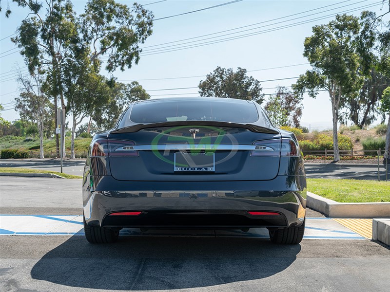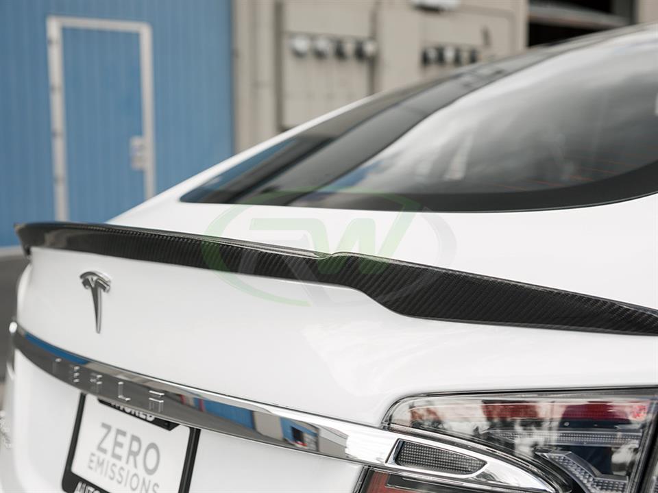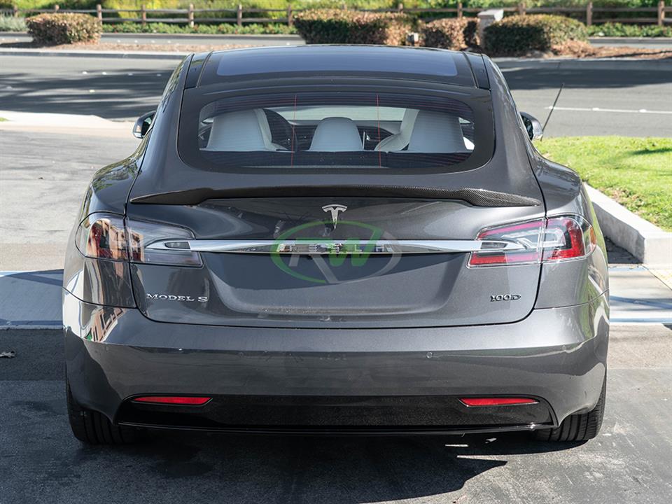 Presenting RW Carbon’s newer and more aggressive styled carbon fiber trunk spoiler for the Tesla Model S. The smaller trunk spoiler we carry is similar in size to the one you can get from Tesla. For any Tesla Model S owners who want a more aggressive looking trunk we have your answer. This spoiler is made using our high strength and lightweight 2×2 weave carbon fiber fabric. Like all of our other Tesla Model S parts it is clear coated for a glossy finish. These trunk spoiler are all shipped and quality checked in our Southern California facility prior to shipping worldwide. Installation is a breeze and only requires 3M tape which can be purchased at checkout. They will fit all 2013+ Tesla Model S.