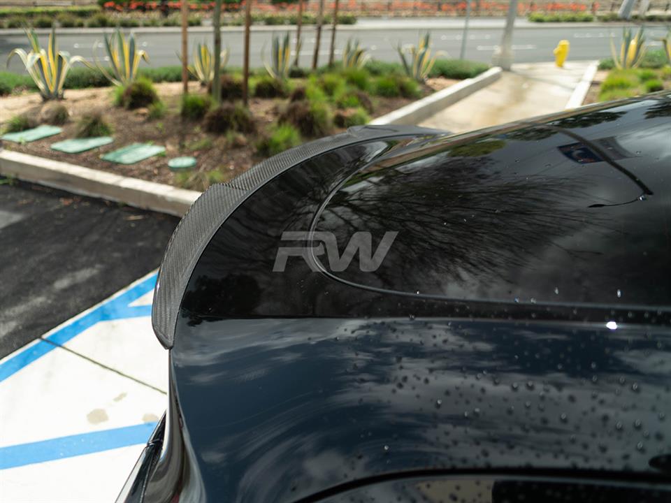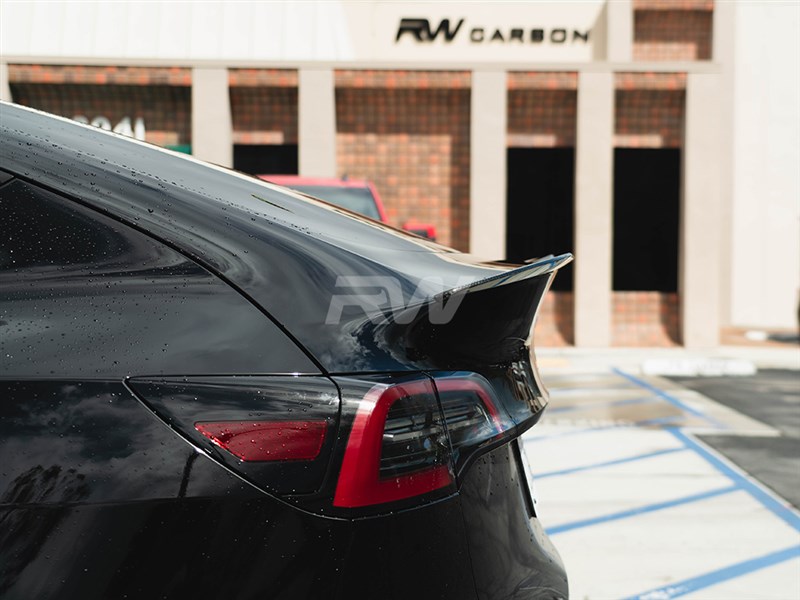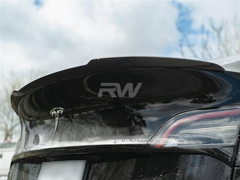 Discover our brand-new Tesla Model Y trunk spoiler made with genuine dry carbon fiber. This spoiler adds an aggressive style to any Tesla Model Y and matches any existing RW Carbon parts you may have on your Tesla. It simply installs on the trunk with 3M double-sided tape in about 30 minutes and leaves no trace if you were to decide to remove it at any time. Each trunk spoiler is always quality-checked and shipped from our Southern California facility. Give your Tesla Model Y an upgrade to its rear end and overall appearance with this Carbon Fiber Trunk Spoiler.