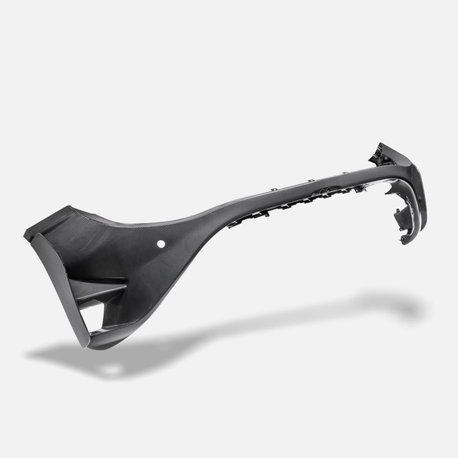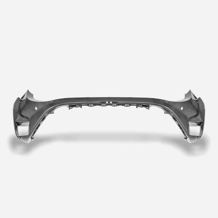 A complete rear bumper shell replacement crafted from premium 2×2 carbon fiber weave. This is not an overlay or cover—it is a full structural component that replaces the OEM bumper with lightweight carbon fiber construction and a flawless gloss clear coat finish.