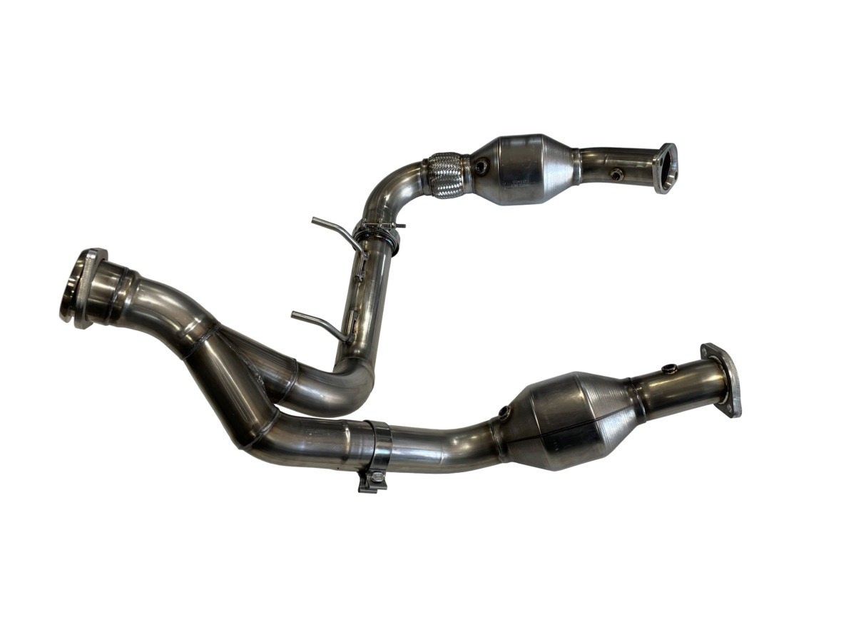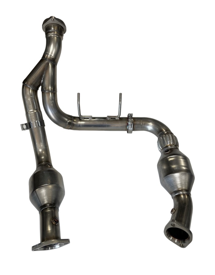 SPD Performance Alpha Catted Down-Pipes for 2024-2026 Ford F-150 3.5L EcoBoost. Features the industry-first Alpha 500-cell ultra high flow green catalytic converters which reduce backpressure, improve turbo spool, and drop exhaust temps while retaining emissions compliance and OEM fitment. SPD Alpha Cat is a 500-cell catalytic converter that outflows previous 400-cell performance cats by over 90%, extra loaded with Rhodium, a platinum-based alloy required to reduce NOX to meet new emission standards. 3-inch mandrel-bent 304 stainless tubing with CNC-cut 1/2-inch flanges. Ultra high-flow catalytic converters free up exhaust flow, sharpen throttle response, and reduce turbo lag while keeping truck emissions-compliant and check-engine-light free. TIG and MIG welded for structural integrity. Does not require custom tuning and can be used as a factory downpipe replacement. Made in the USA.