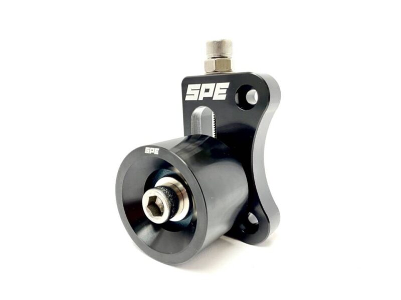 The SPE 2020+ GT500 Adjustable Auxiliary Idler consists of a precision CNC machined billet aluminum bracket and extreme duty double ball bearing idler pulley anodized black. Adjuster components & hardware are made of billet 304 stainless.