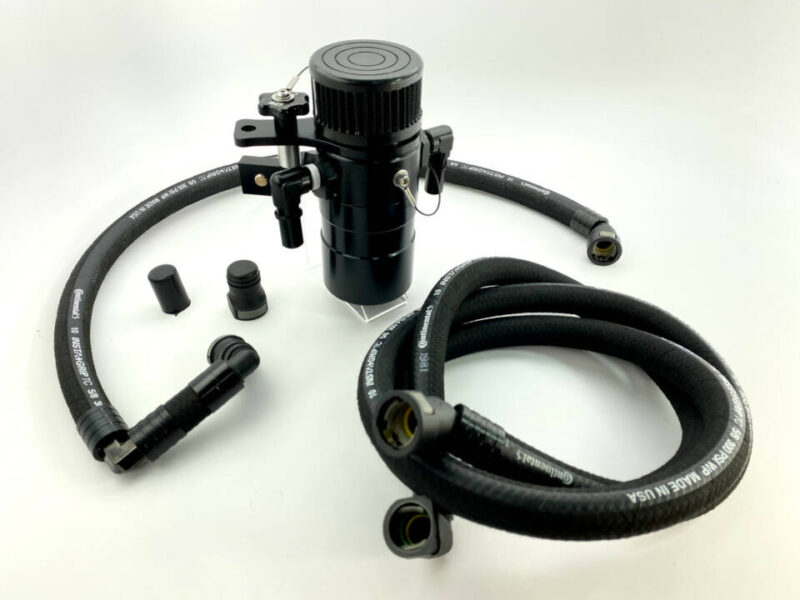 Mounts to the passenger side fender tab. Includes a Plug N Play ™ cap for the factory supercharger vacuum port. From the exact fit UPR Braided lines, Exclusive UPR Plug N Play ™ fittings and UPR Quick Release Billet mounting bracket system. Giving you everything needed to protect your engine from any unwanted Blow-by. UPR Breather tanks are easy to drain with either the provided petcock or you can unscrew the containment cup to drain, inspect and clean the contents out. You can’t do that with those over priced welded up breather tanks!