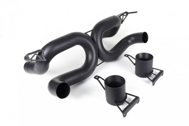 Voodoo Design & Engineering Ferrari 488 Exhaust System features an x-pipe design for proper scavenging of exhaust pulse and a higher exhaust pitch and Cerakote thermal finishing to reduce under hood temperatures and maintain a beautiful finish for years.