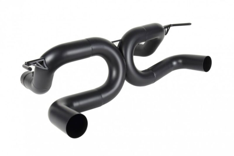 Voodoo Design & Engineering Ferrari F8 Tributo Exhaust System features an x-pipe design for proper scavenging of exhaust pulse and a higher exhaust pitch and Cerakote thermal finishing to reduce under hood temperatures and maintain a beautiful finish for years.