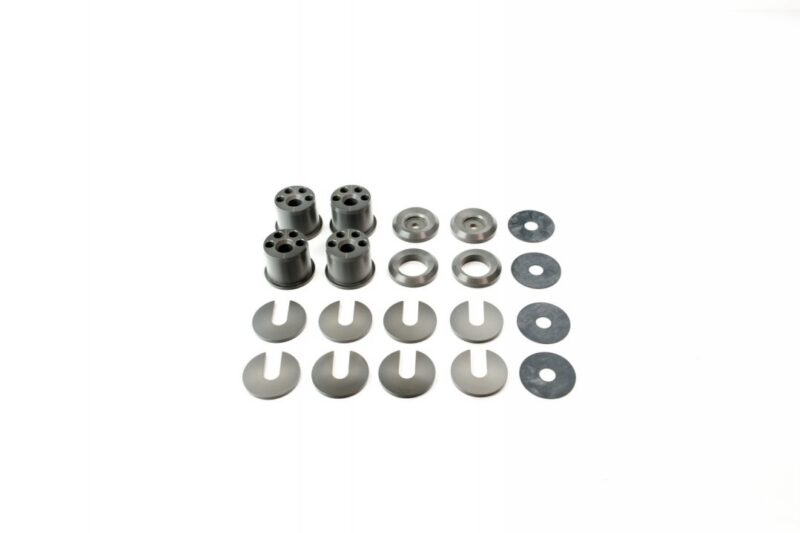 Voodoo13 adjustable aluminum subframe conversion bushings allow you to bolt in a S14/S15 subframe into your S13. They are designed to rid subframe to chassis play by eliminating the soft OEM rubber bushings. Solid subframe bushings are a sure way to reduce unwanted wheel hop as well as maintaining set suspension geometry. Unlike the competition, our subframe bushings feature a unique deep angle chamfer in the center to lessen the difficulty of the subframe re-installation to the chassis. Instead of re-using the rear factory finishing caps like other companies, Voodoo 13 provides their own finishing caps to add to the aesthetics to an otherwise bland part of the car. The front subframe mounts use a beveled ring to utilize the factory subframe braces. Slide-in shims allow quick subframe adjustment without removal, to either raise or lower the mounting points. Lowering the subframe will decrease anti-squat while simultaneously increasing the roll-couple, while raising the subframe will correct roll center on a lowered car while increasing anti-squat.